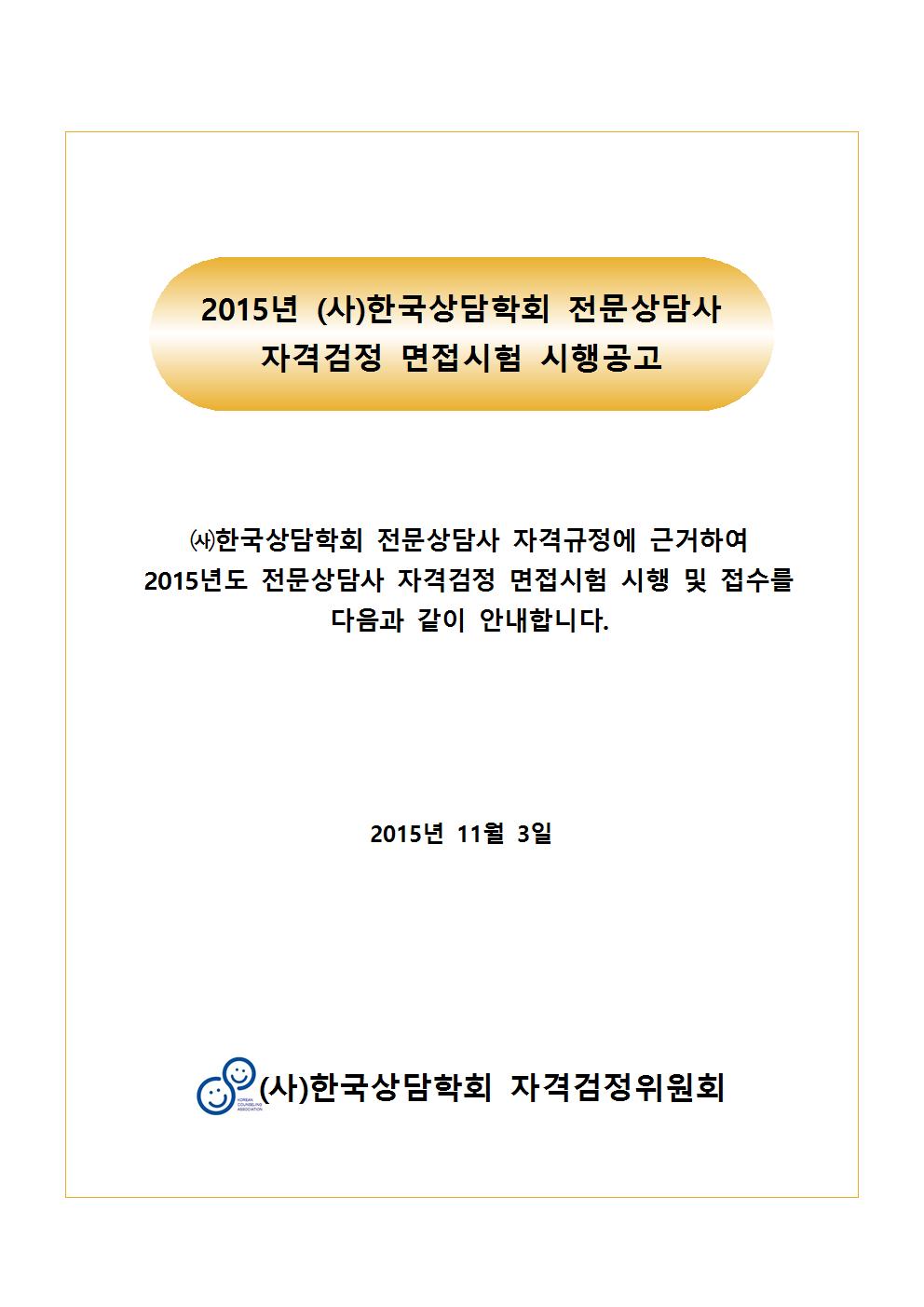 ※ 첨부파일 「2015년 전문상담사 면접시험 시행공고」를 반드시 참고하여 주시기 바랍니다. ※ p.3 자격취득연수 시간 변경