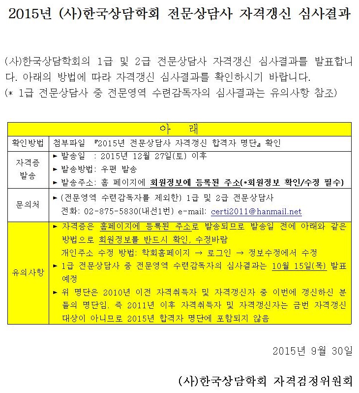 2015년 전문상담사 자격갱신 심사결과
