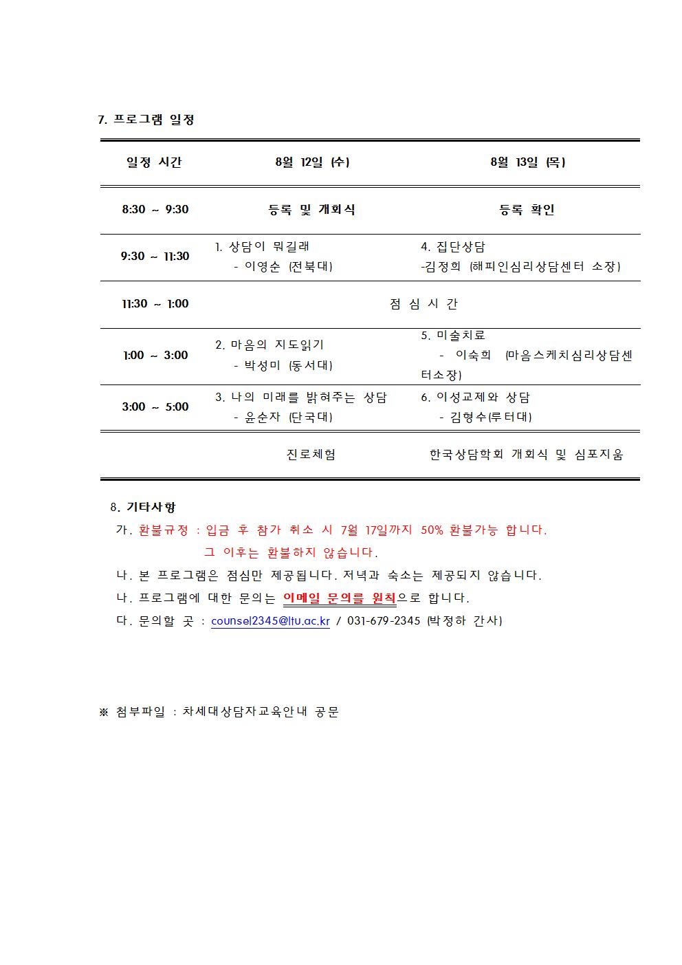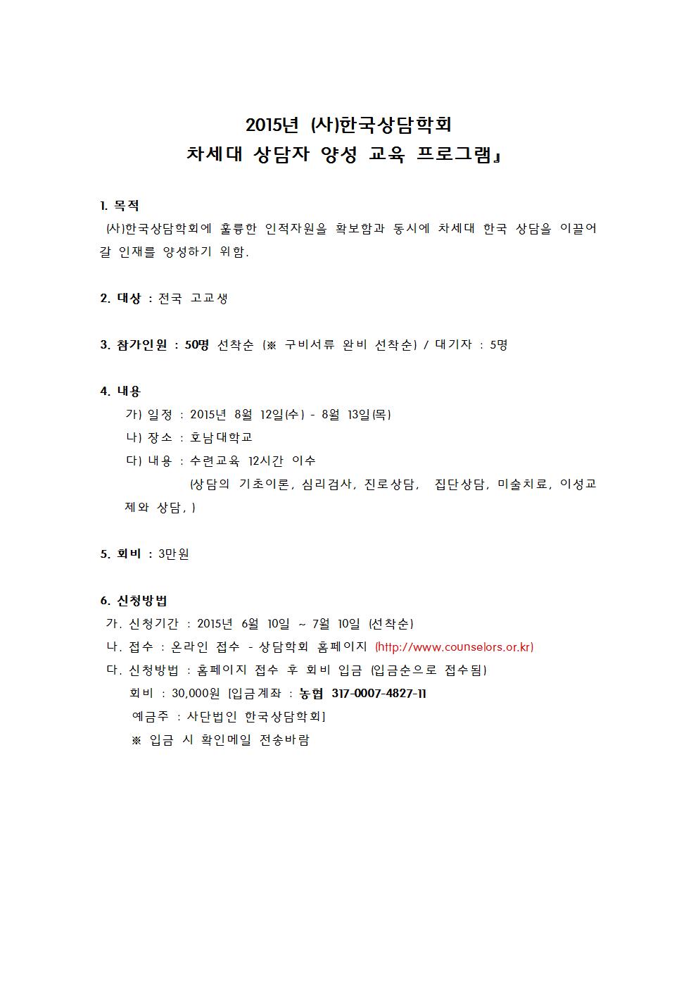 (사)한국상담학회 사무국 주소 : (137-817) 서울시 서초구 방배동 92, 세양아르비체 102-405호 Tel : (02) 875-5830 / Fax : (02) 874-7351 / E-mail : webmaster@counselors.or.kr (사)한국상담학회 홈페이지 : www.counselors.or.kr |