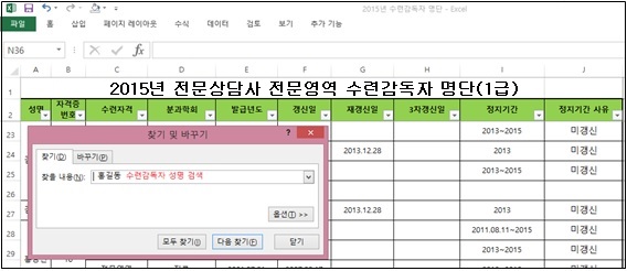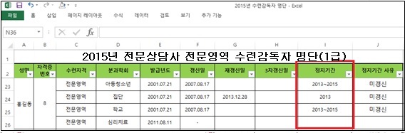 1. 첨부파일 [2015년도 전문상담사 전문영역 수련감독자], [2015년도 전문상담사 일반 수련감독자]를 클릭하여 열기