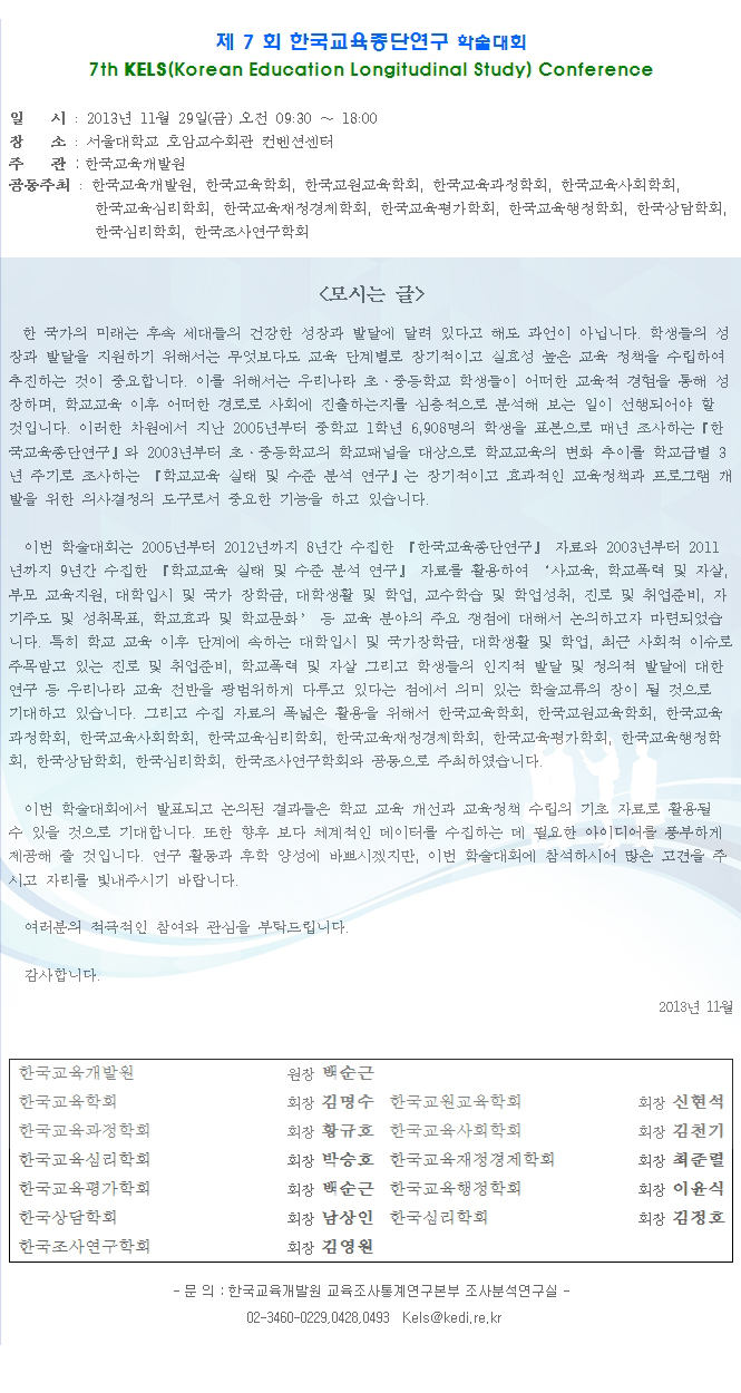 한국교육개발원 공동주최) 제7회 한국교육종단연구 학술대회 안내(11월29일)