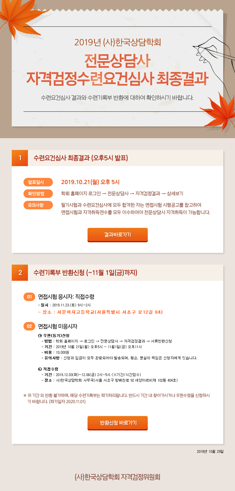 2019년 전문상담사 수련요건심사 결과발표 및 수련기록부 반환 신청(오후5시부터)