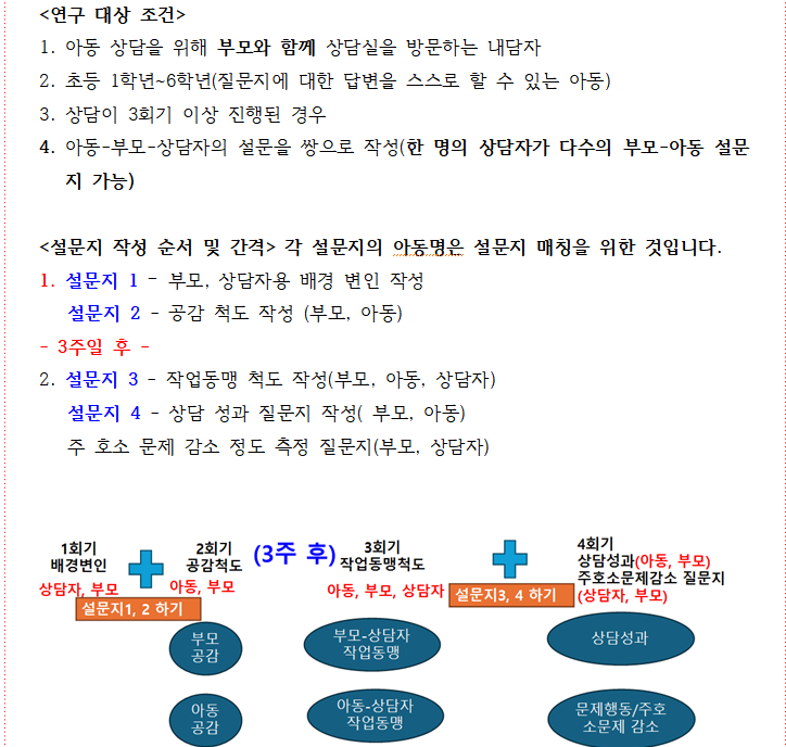● 상담자-부모-아동 쌍으로 이루어지는 연구입니다. 관심있는 선생님들의 참여를 부탁드립니다.