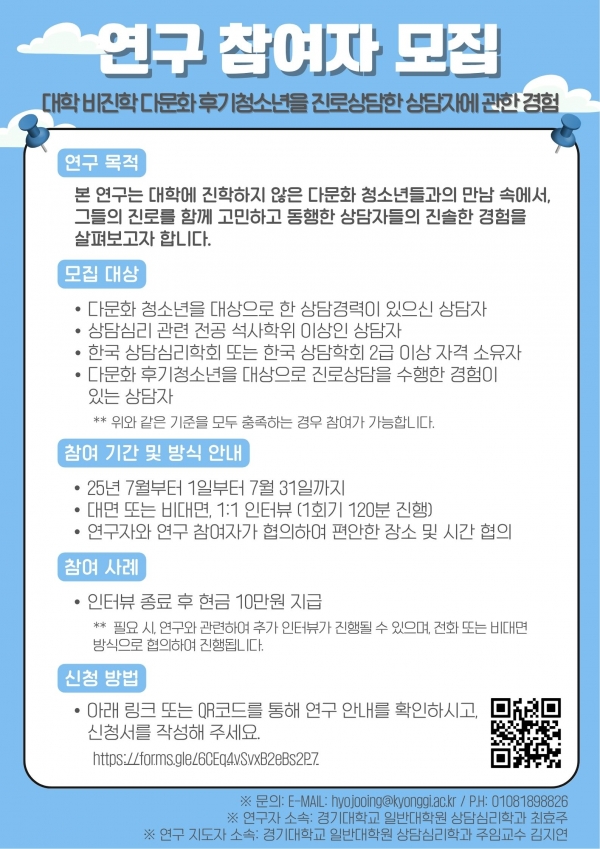 안녕하세요. 현재 석사 학위논문 연구로, "대학에 진학하지 않은 다문화 후기청소년과의 진로상담 경험"을 주제로 연구를 진행하고 있으며, 다음과 같은 기준에 해당하는 상담자분을 연구 참여자로 모집하고 있습니다. @ 연구 목적 @ 모집 대상